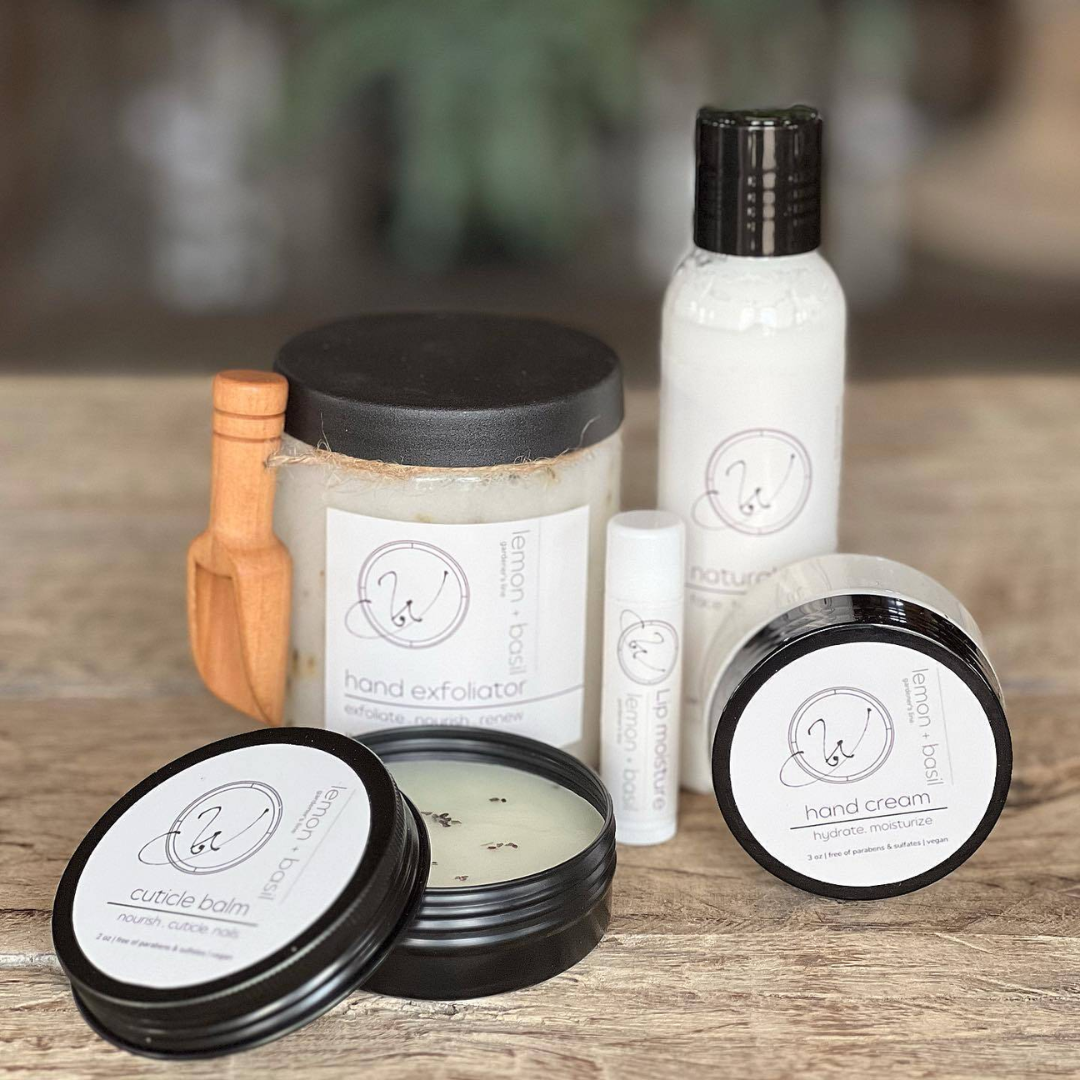 Hand exfoliator, cuticle balm, lip moisture, hand cream and sunscreen. All natural, lemon and basil scented. Perfect for the gardener in your family.